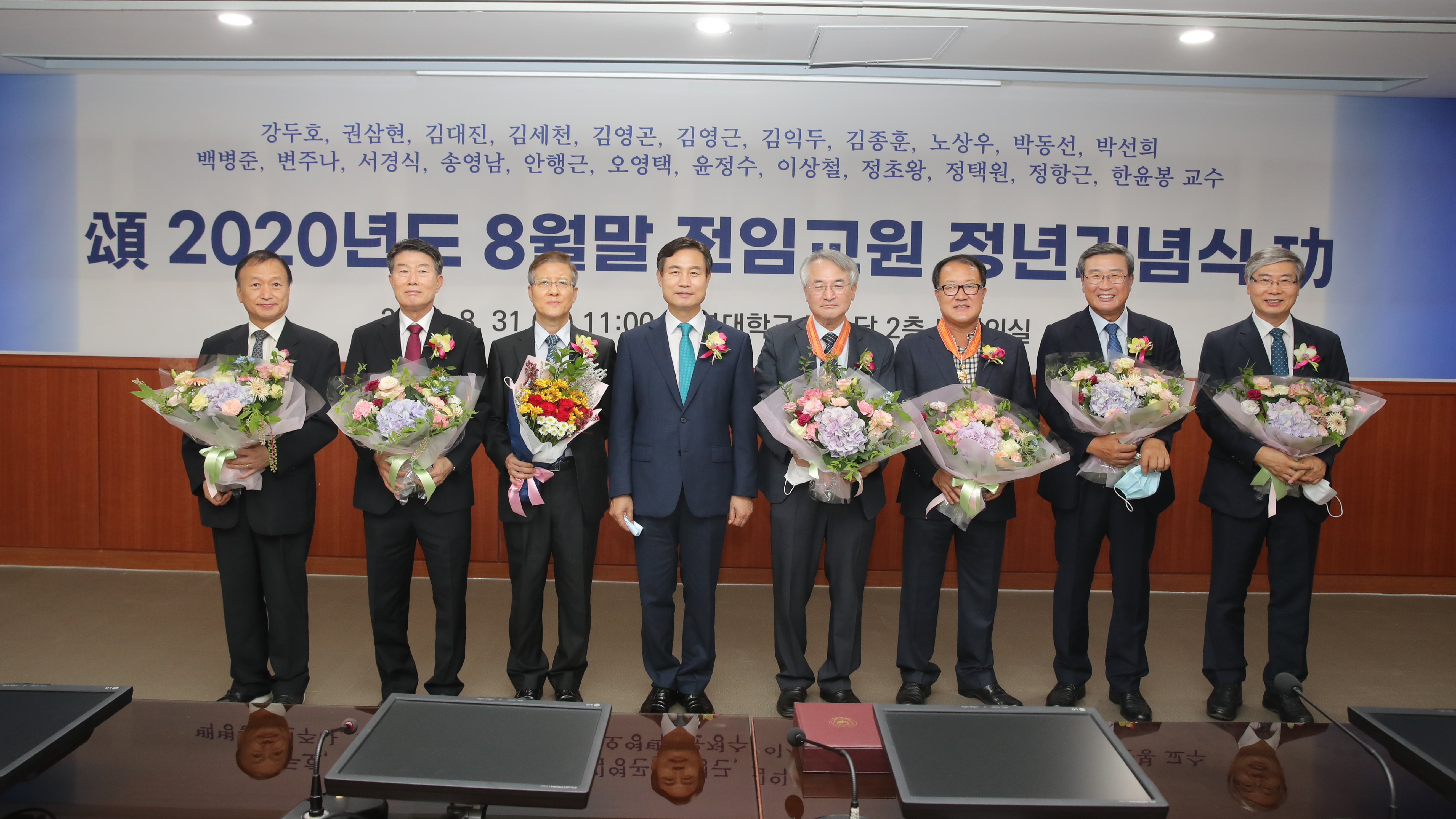 코로나19로 인해 예년보다 간소하게 치러진 이번 정년 기념식에서는 김동원 총장을 비롯한 보직자들과 퇴임 교수 및 가족 등이 참여해 축하와 감사의 마음을 전했다.