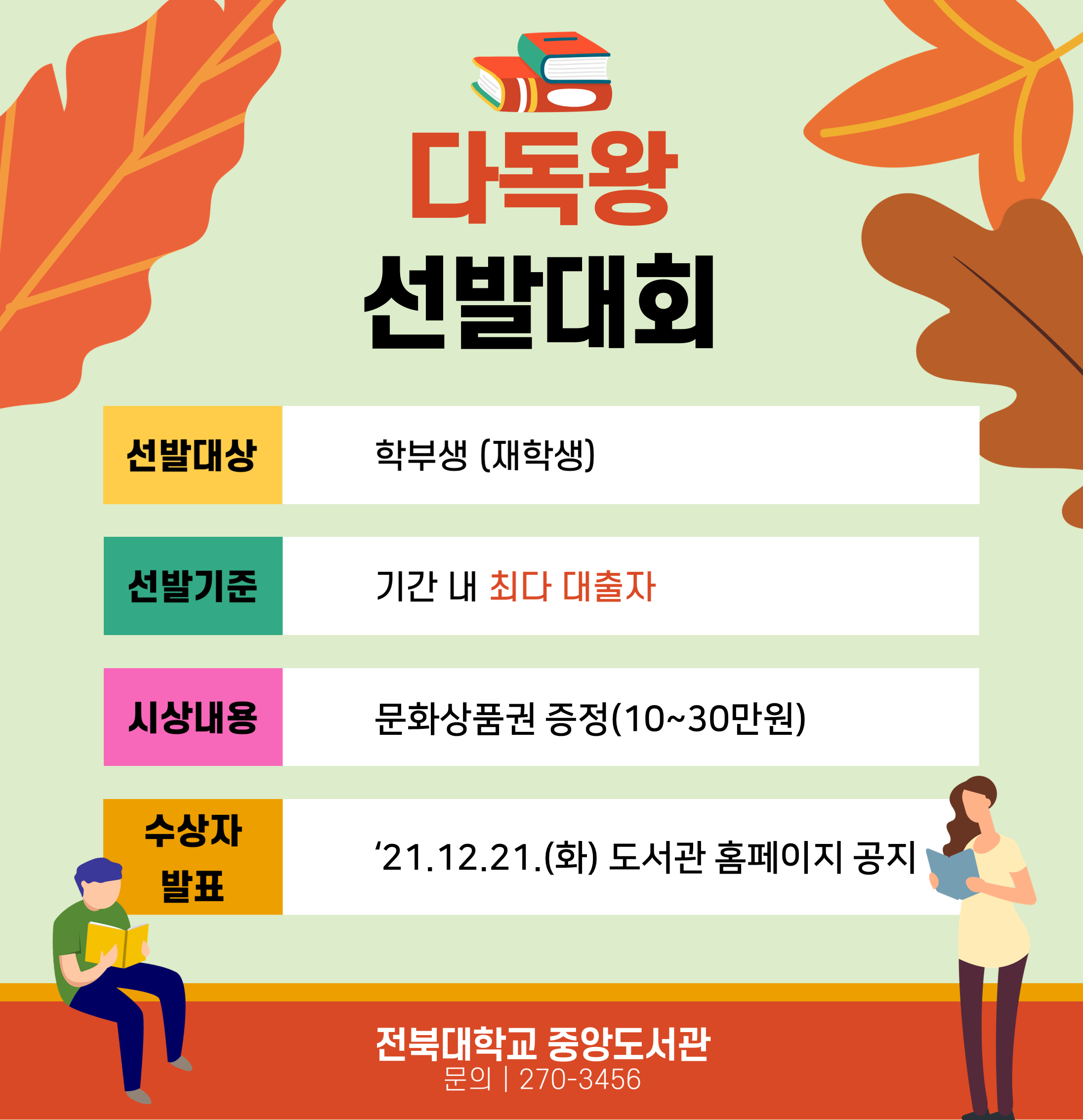 도서관은 학부 재학생을 대상으로 3~12월까지 대출기간별 반영비율에 따라 가장 많은 도서를 대출한 학생을 선발할 예정이며, 대상 1명, 최우수상 1명, 우수상 2명, 장려상 3명에게 각각 상장과 문화상품권이 수여된다.