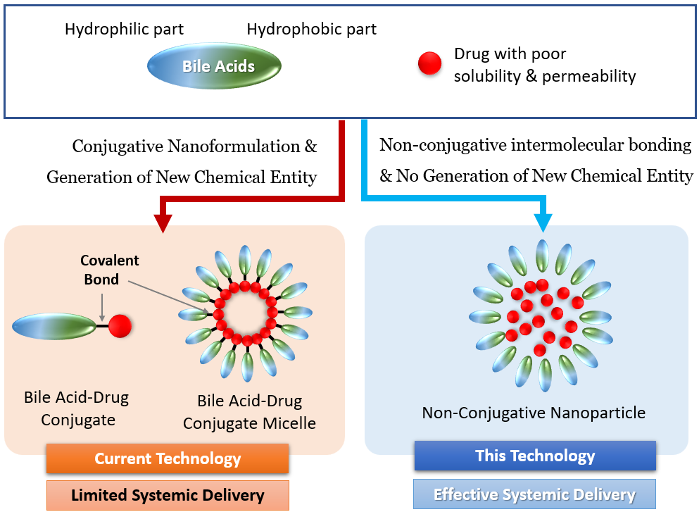공동연구팀이 개발한 기술은 인체 콜로스테롤 항상성 유지를 담당하는 담즙산의 생성·순환 과정을 모사한 약물 전달 기술이다. 담즙산은 마치 세제와 유사한 역할을 해서 소수성 물질을 나노 수준으로 녹게 한다. 장에 도달한 대부분의 담즙산은 장간순환에 의해 간으로 재흡수돼 혈류로 돌아 체내에 전달된다.