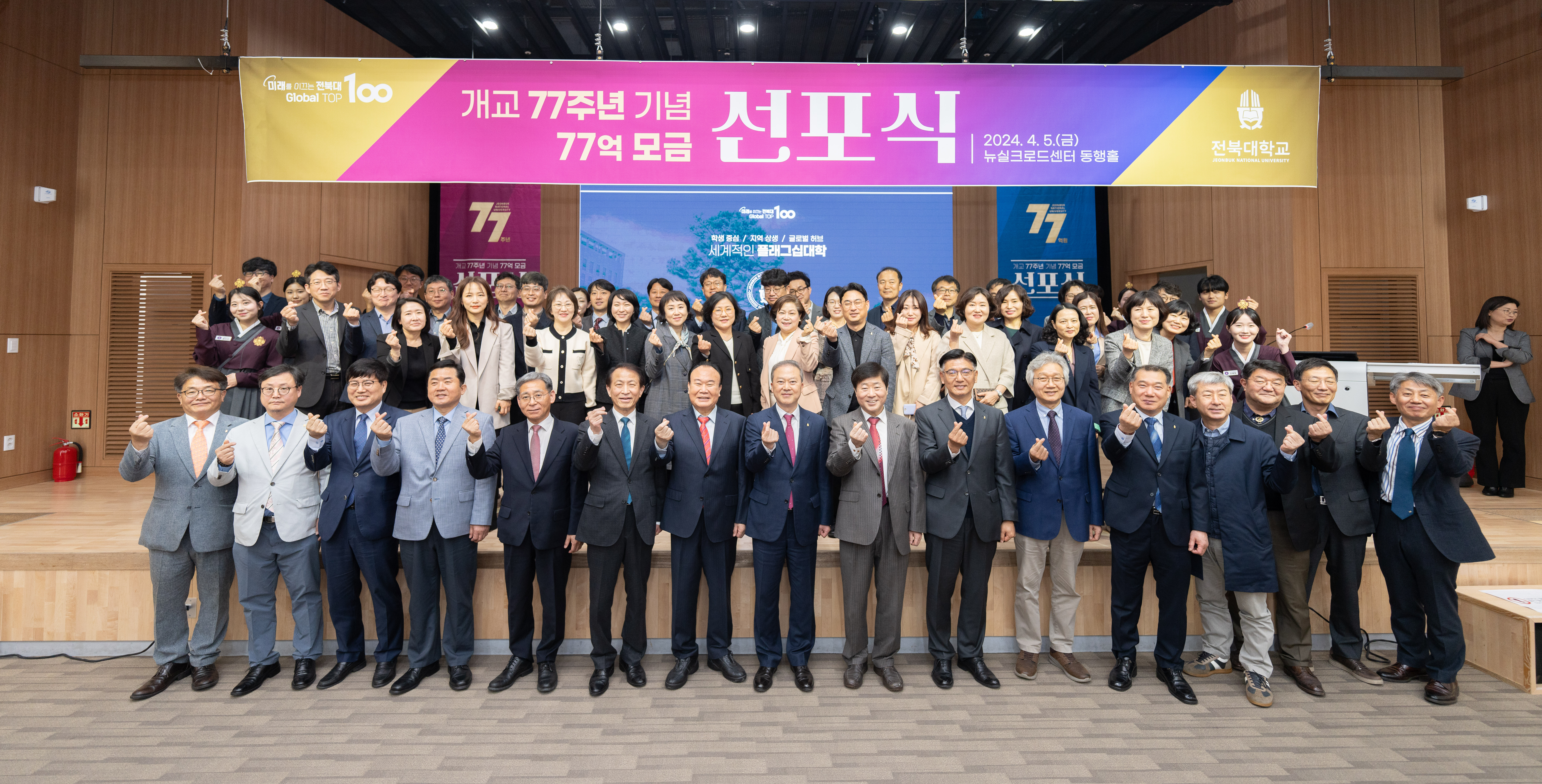 전북대는 4월 5일 오전 11시 뉴실크로드센터 동행홀에서 양오봉 총장과 본부 보직교수, 최병선 총동창회장, 직원협의회장 등 대학 주요 구성원들이 참석한 가운데 77억 원 모금을 위한 선포식을 가졌다.