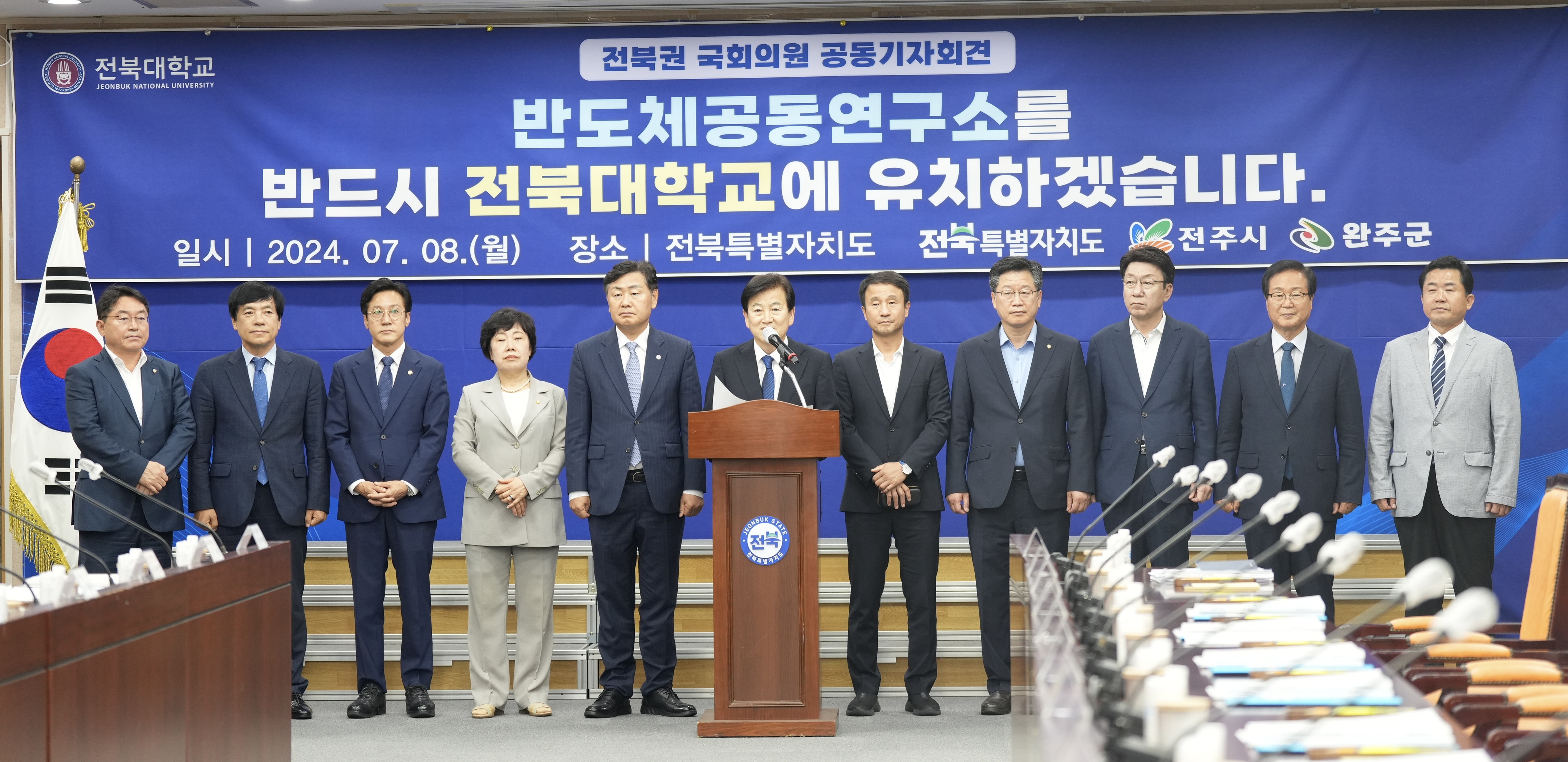 지역구 국회의원과 전북대, 전북특별자치도, 전주시, 완주군 등은 8일 전북특별자치도청에서 기자회견을 통해 반도체공동연구소 유치의 필요성과 전북대 선정을 촉구했다. 지자체와 지역 연구기관, 기업 등에 이어 지역 정치권까지 유치를 위해 힘을 모으기로 한 것이다.